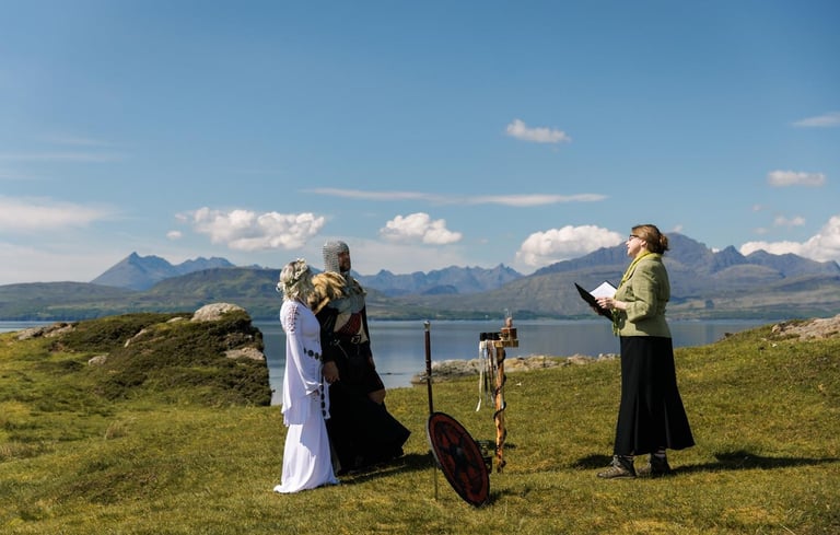Auf der Isle of Skye, zwischen historischen Ruinen und unberührter Natur, feierten Silke und Sven ihre deutsche freie Trauung. Handfasting, Met und symbolische Rituale verliehen ihrer Mai-Zeremonie Tiefe und Persönlichkeit und machten den Tag zu einem intensiven, unvergesslichen Erlebnis in Schottlands Naturkulisse.