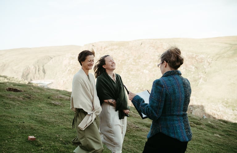 Franziska und Anika erneuerten ihr Eheversprechen zum 10. Jahrestag auf der wilden Halbinsel Stoer. Trotz stürmischem Wetter nahmen sie die Naturgewalten gelassen an und feierten in einem geschützten Bereich, wodurch die dramatische Küstenlandschaft Teil ihrer persönlichen Zeremonie wurde.