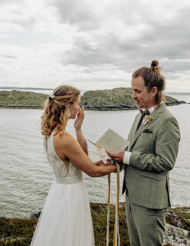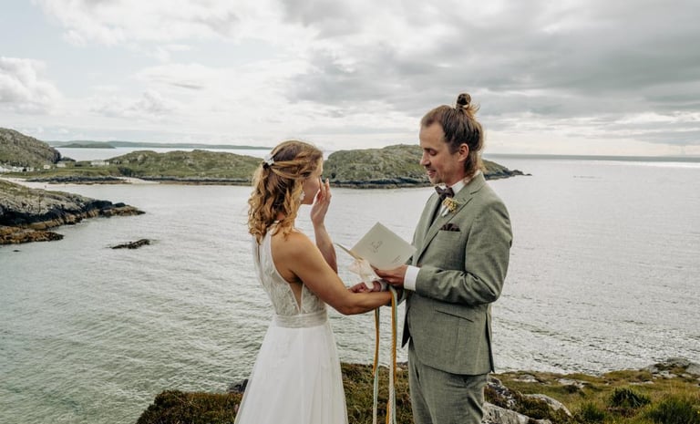 Larissa und Basti feierten ihre deutschsprachige freie Trauung völlig privat am abgelegenen Achmelvich Beach. Die Zeremonie begann auf den Klippen mit Panoramablick über die Bucht und endete unten am Strand. Persönliche Rituale und intime Momente machten diesen Tag zwischen Meer und Himmel zu einem unvergesslichen Erlebnis.
