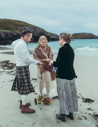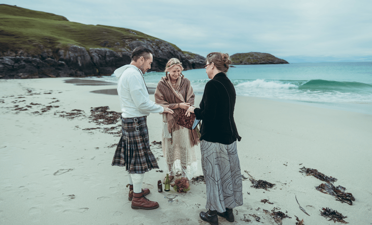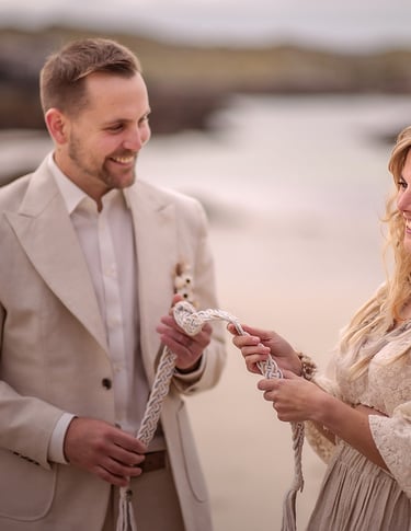 Nach ihrer standesamtlichen Trauung in Deutschland reisten Tanja und Ralph für ein symbolisches Handfasting an den Achmelvich Beach in Schottland. Der flexible Ablauf erlaubte es, den perfekten sonnigen Nachmittag am Strand zu genießen, während die persönliche Gestaltung der Zeremonie ihren individuellen Charakter unterstrich.