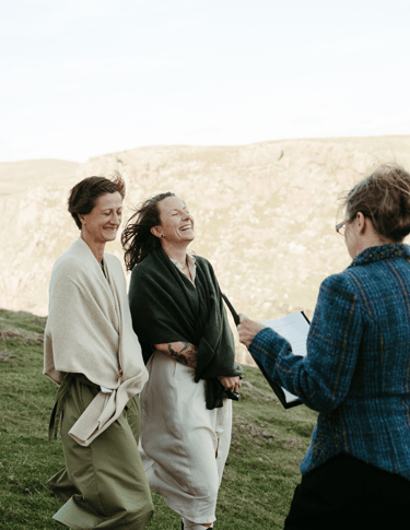 Franziska und Anika erneuerten ihr Eheversprechen zum 10. Jahrestag auf der wilden Halbinsel Stoer. Trotz stürmischem Wetter nahmen sie die Naturgewalten gelassen an und feierten in einem geschützten Bereich, wodurch die dramatische Küstenlandschaft Teil ihrer persönlichen Zeremonie wurde.