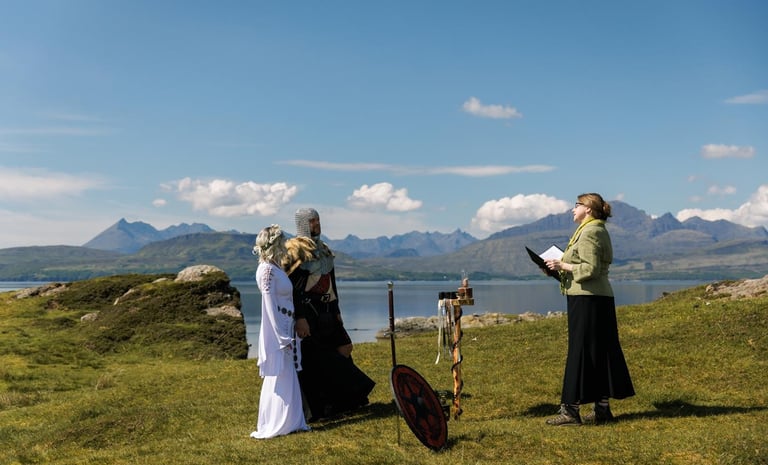 Auf der Isle of Skye, zwischen historischen Ruinen und unberührter Natur, feierten Silke und Sven ihre deutsche freie Trauung. Handfasting, Met und symbolische Rituale verliehen ihrer Mai-Zeremonie Tiefe und Persönlichkeit und machten den Tag zu einem intensiven, unvergesslichen Erlebnis in Schottlands Naturkulisse.